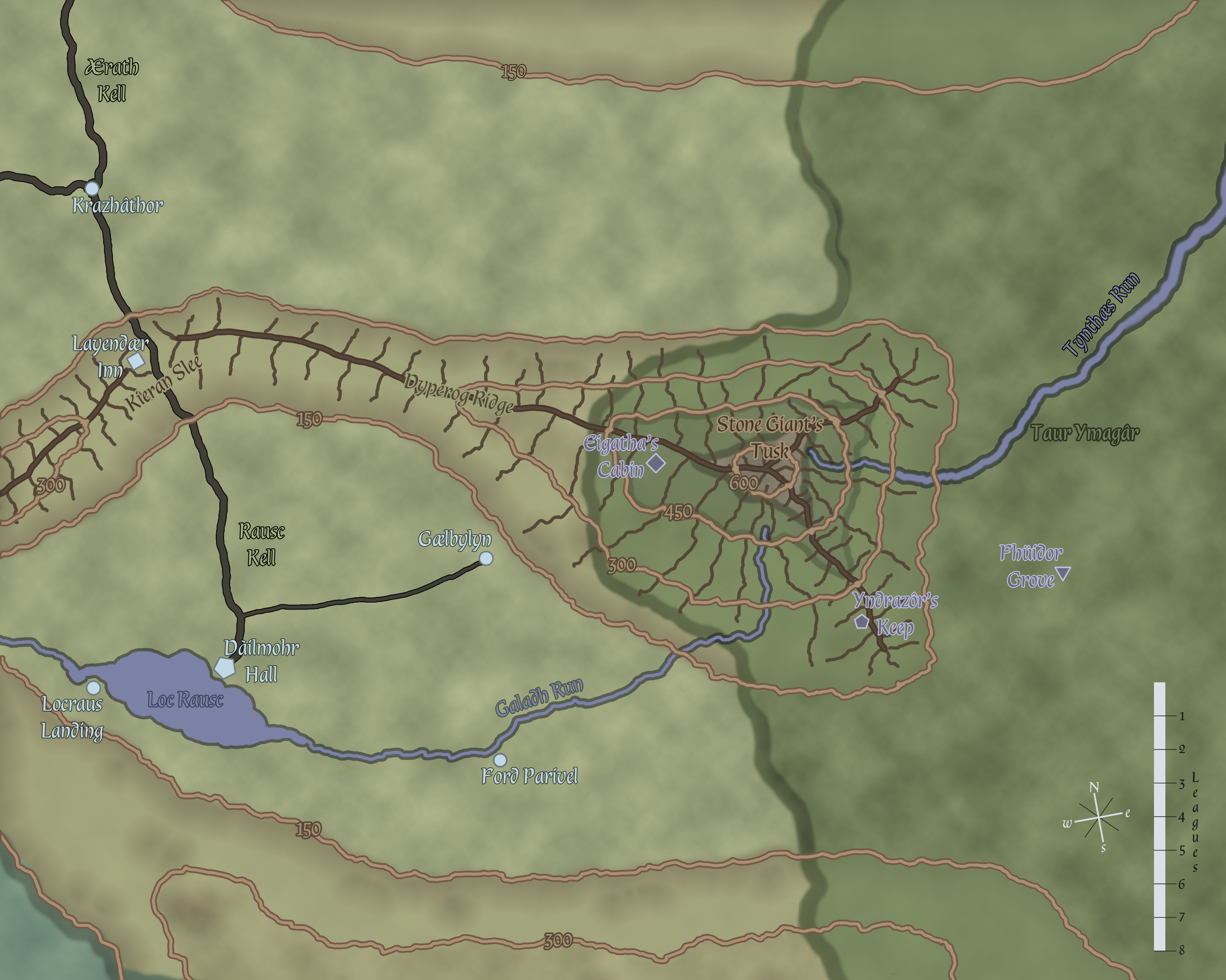 .This area is much more manageable, and believable for characters to be familiar with from the start. Everyone will know landmarks like the Stone Giant’s Tusk, the Kieran Slee with the Layender Inn. Beyond this little area, you can tell the players about what their characters have heard. Like the marshes to the South, the Great Hall of the Rígh (king) to the North, and the Great Stone Circles of the Druids somewhere off to the West.