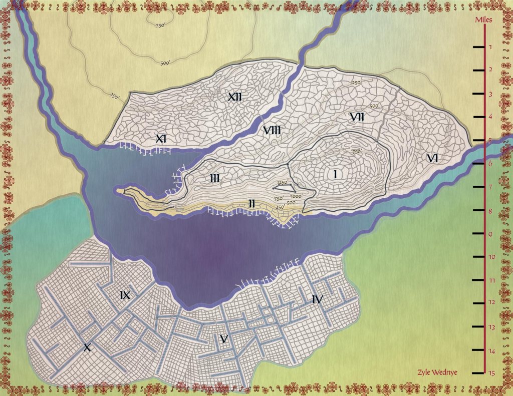 The twelve canton of Arjenvís, the City of Miseries. Map by the Author